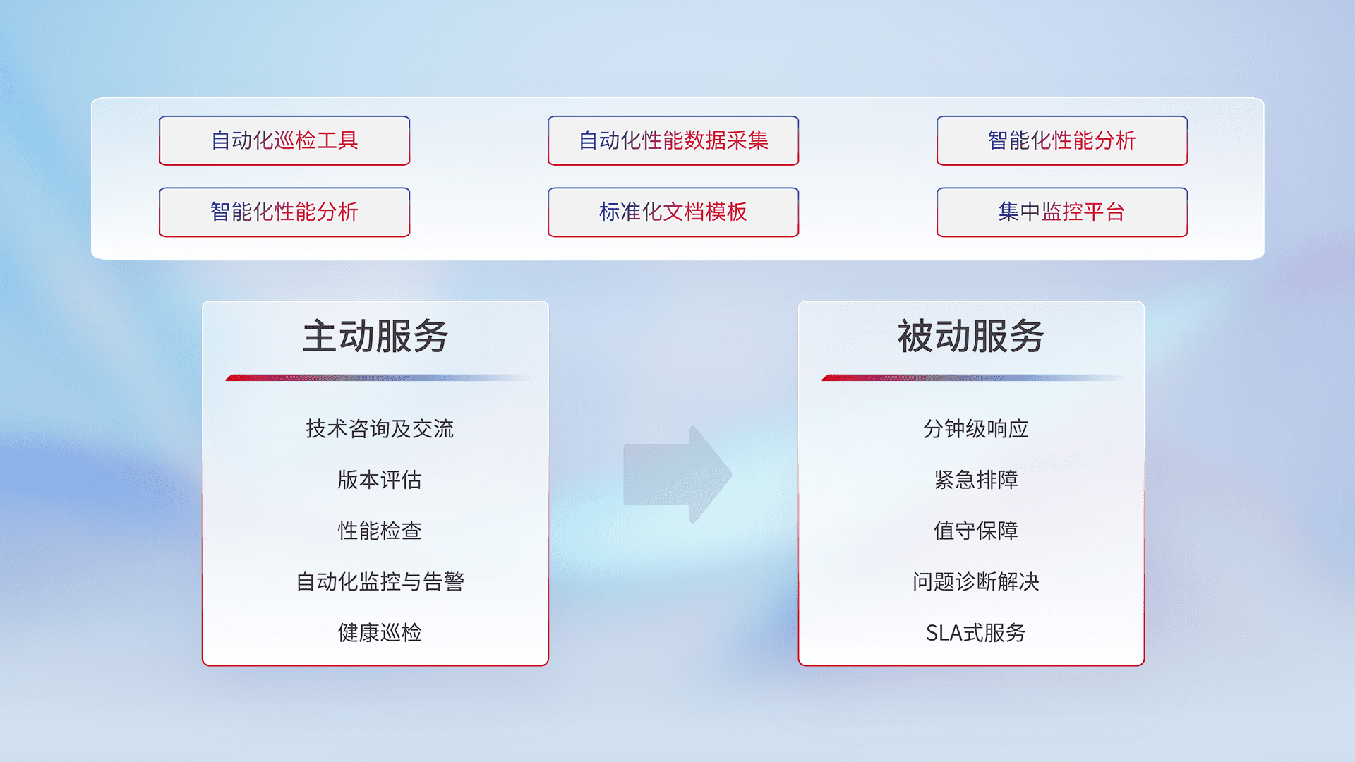 智能化工具和标准化文档,,,,保障服务质量,,,提供主动服务(包含技术咨询、、、、版本评估、、性能检查、、自动化监控与告警、、健康巡检)和被动服务包含(分钟级响应、、、紧急排障、、值守保障、、、问题诊断解决、、、、SLA服务)。。。