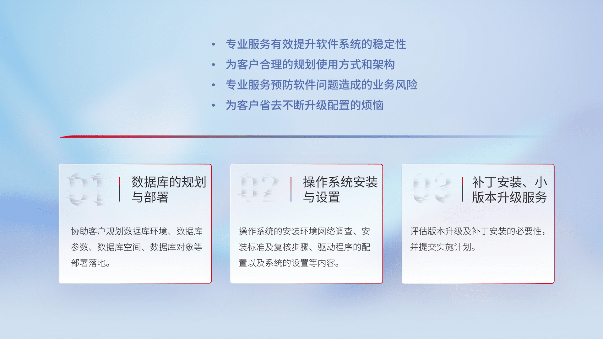 为客户提供软件规模升级、、、快速部署、、按需配置的专业服务,,,,从数据库的规划与部署到操作系统的安装与设置,,再到补丁安装和小版本升级提供支持。。